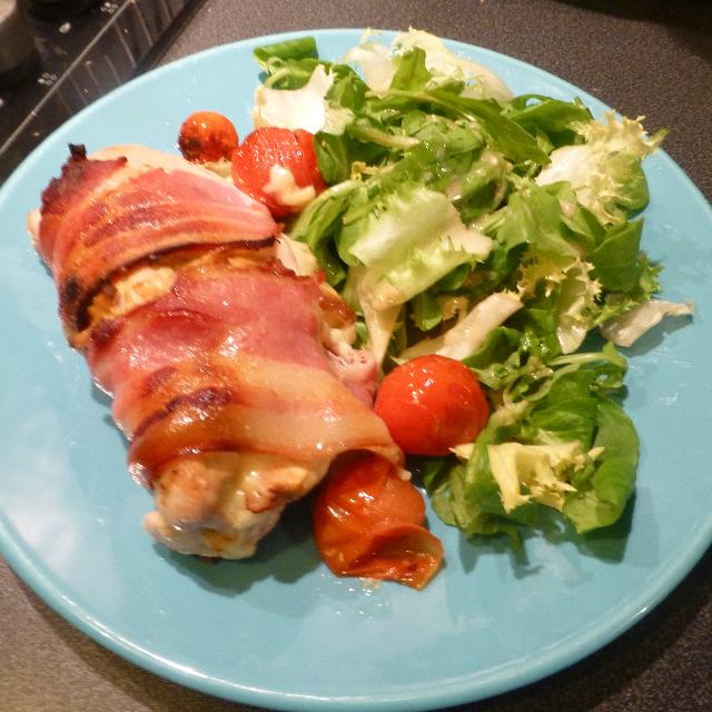 - Enrouler chaque blanc de poulet dans une tranche de poitrine fumée et badigeonner les de moutarde.